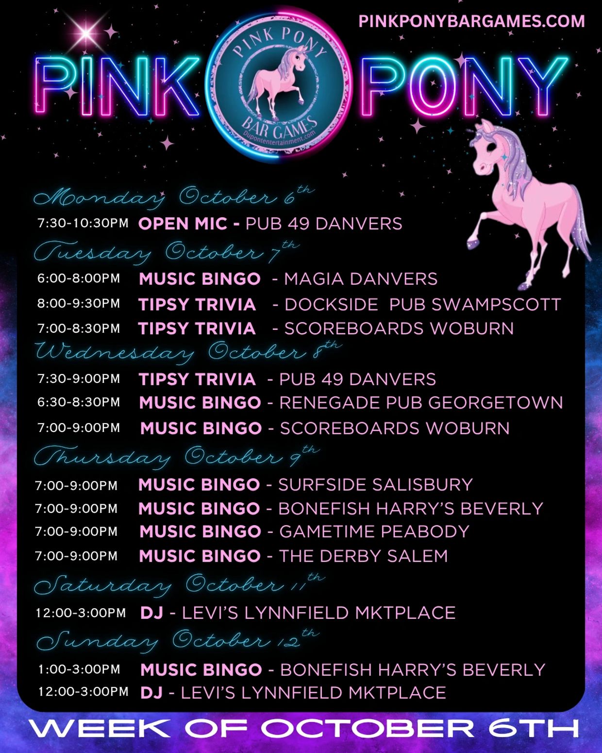 We Offer Pink Pony Music Bingo, Tipsy Trivia, Karaoke, Open Mic Hosting, Photo Booths, Dj’s, live music and more!!